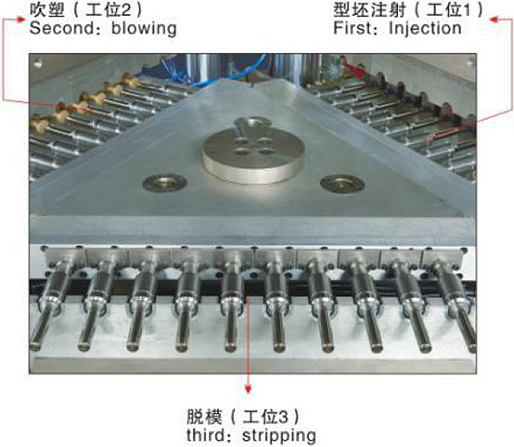 一步法注吹工藝的核心部件是一個三角轉(zhuǎn)盤,按120度旋轉(zhuǎn),芯棒安裝在轉(zhuǎn)盤的端面。