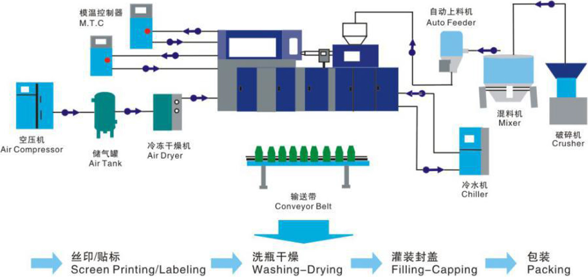 在這工位完成脫模,然后就通過流水線進行包裝或灌裝了,注射、吹塑、脫模三動作同時進行,高效節(jié)能。